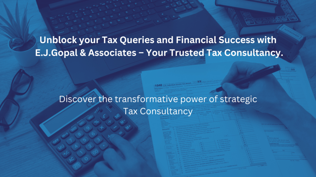 Discover the transformative power of strategic Tax Consultancy. Contact E.J.Gopal & Associates personally at our office or at connect@ejgopalassociates.com or call on Whatsapp +919398356673 today and embark on a journey towards financial success.